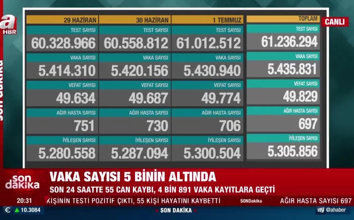 1 Temmuz Korona Tablosu Bugunku Vaka Sayisi Kac Haberler